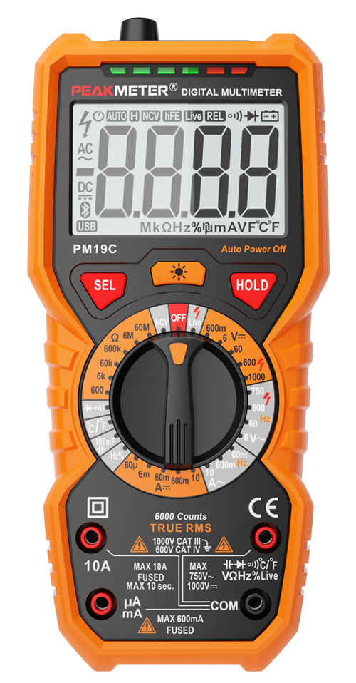 PeakMeter PM19C – это портативный многофункциональный цифровой мультиметр с функцией измерения среднеквадратического значения True RMS, оснащенный большим ЖК-дисплеем с задней подсветкой для удобства считывания показания, и фонарем. PeakMeter PM19C имеет функцию защиты от перегрузки и индикацию разряженной батареи.