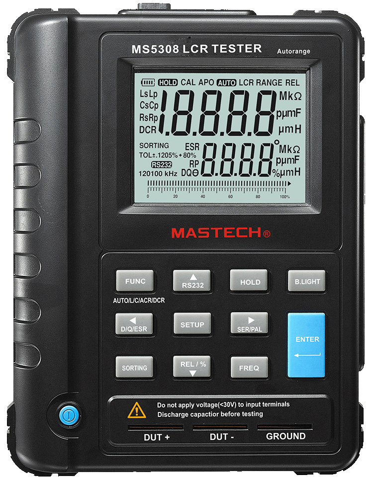 Цифровой измеритель LCR MS5308 представляет собой профессиональный инструмент для измерения индуктивности, емкости и сопротивления с широкими возможностями, в том числе автоматическая идентификация типа пассивного элемента, автоматический выбор предела измерения, высокие точность и скорость измерения, широкий диапазон измерения и т.д. В то время как обычный мультиметр при измерении сопротивления обеспечивает только режим постоянного тока, Mastech MS5308 позволяет работать в режиме как переменного, так и постоянного тока. В режиме переменного тока для лучшего удовлетворения современных потребностей измерения индуктивности, емкости и сопротивления в приборе предусмотрен набор различных частот испытательного сигнала вплоть до 100 кГц.