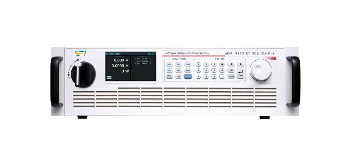 Серия АКИП-1188 представляет собой программируемые источники постоянного тока с широким диапазоном выходных параметров, высокой удельной мощностью и расширенными функциональными возможностями. В автономном исполнении шасси соответствует стандарту 19 дюймов, высотой 3U, и обеспечивает мощность до 18 кВт. КПД устройства достигает 93 %. Максимальная мощность в каскадной конфигурации — до 180 кВт, выходной ток — до 5100 А, напряжение — до 2250 В. Благодаря комплексному набору функций и поддержке множества интерфейсов управления, АКИП-1188 идеально подходит как для лабораторных исследований, так и для интеграции в автоматизированные системы тестирования (ATE).