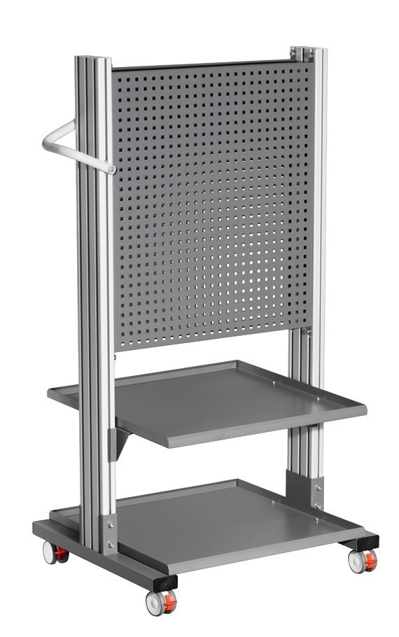 Подкатная стойка с перфорированной стенкой и удобной боковой ручкой для инструмента и оборудования. Перфорированная стенка позволяет крепить любые стандартные держатели для инструмента и комплектующих (К-01 - К-10). Стойка оборудована 4 колесиками, все со стопорным механизмом.