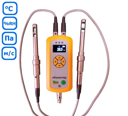 • еКологгер 42 (ТНРV+TH) – двухканальный измеритель с возможностью измерения температуры, влажности, скорости движения воздуха и атмосферного давления по одному каналу и температуры и влажности воздуха по второму каналу (щупу);